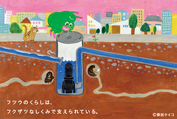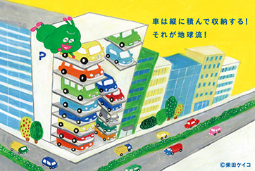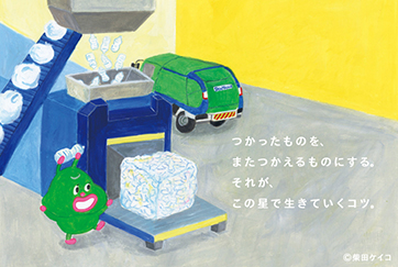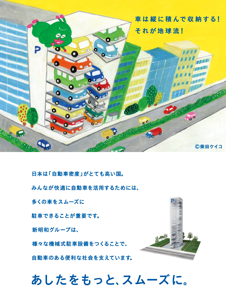 今回モチーフとなった製品(航空旅客搭乗橋+航空機の主翼スパー、塵芥車+リサイクルセンター、水中ポンプ、機械式駐車設備、DDモータ)は、宇宙人をはじめ当社グループのことをご存じない一般の方にとって身近な存在から選出し、日々の「当たり前」を新明和グループがつくり出していることを知っていただくきっかけになれば、との想いで制作しました。
