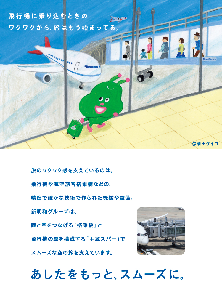 初めてこのお仕事のお話を伺った時、あの航空旅客搭乗橋が新明和工業さんが作られたものだと知って驚きました。よく出張で飛行機に乗ることが多い私はそれから搭乗橋を通るたびにこのお仕事をいただけたことをちょっと誇らしく思っています。