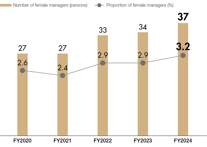 The Group is promoting the creation of workplace environments where employees can demonstrate their abilities irrespective of gender. However, owing to the nature of manufacturing business, the proportion of male employees is high especially in plants and production sections, and the percentage of female workers in management positions remains low. Based on the understanding of this structural challenge, we will provide women with more opportunities for recruitment, development, and assignment and pursue the creation of an environment where women can play active roles in management positions.
