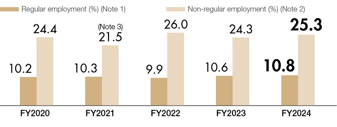 - (Note 3) The decline is due to a decrease in the number of female employees (non-regular), and an increase in the number of non-regular employees joining the Group through M&As.
