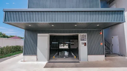 Developed a hybrid, fully automated, multi-storied system. The position and number of entrances/exits can be freely configured, helping reduce the area required for driveways.