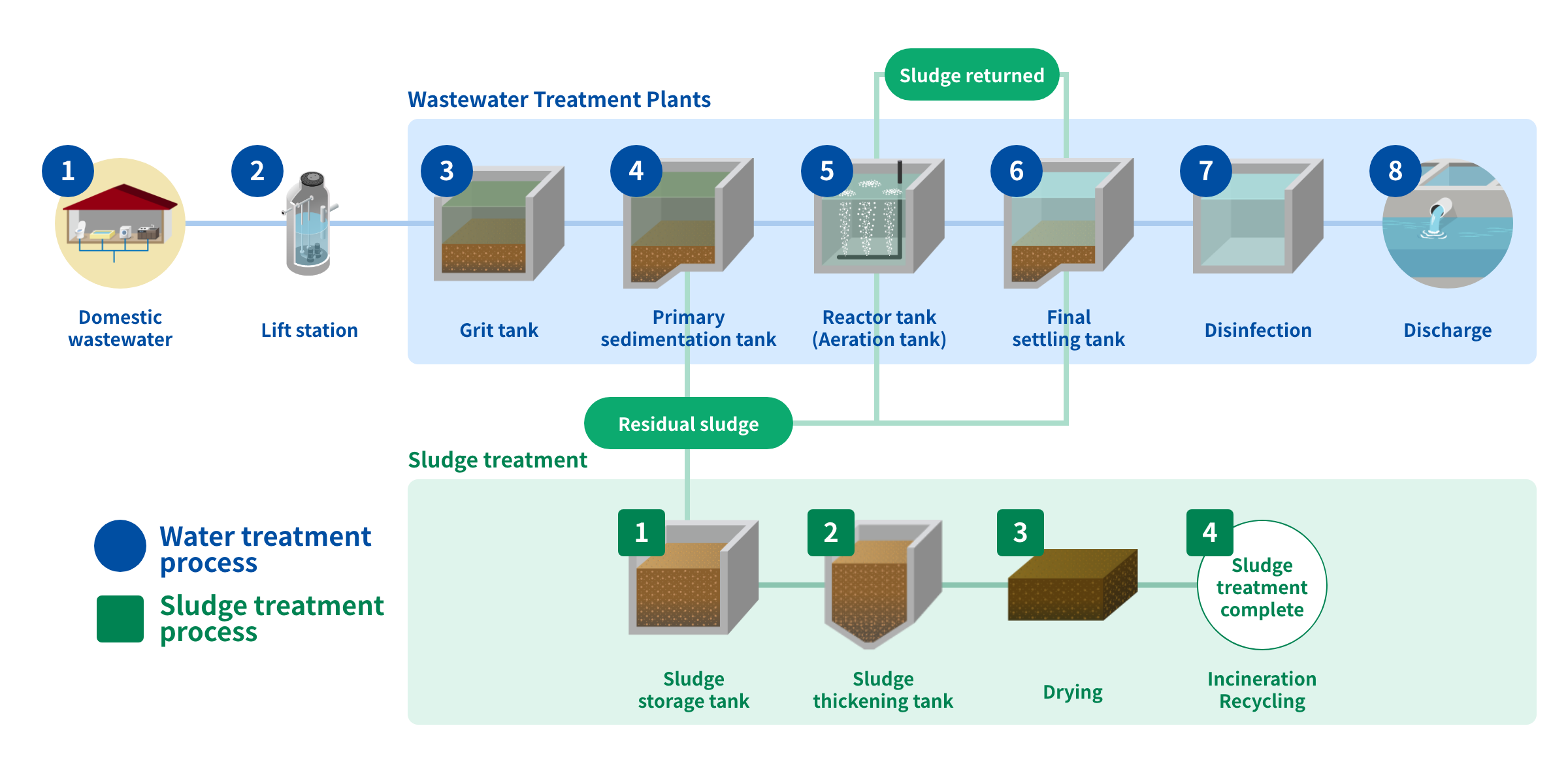 Water used in everyday living, such as drainage from the bath, kitchen, and toilet, is emitted as wastewater.