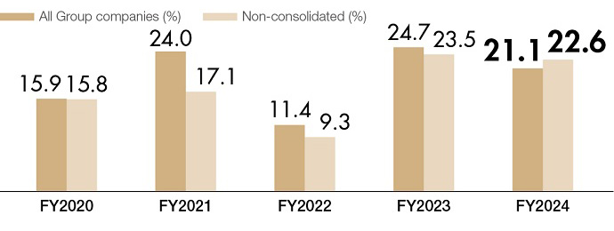 Results: 23.5% in FY2023, 22.6% in FY2024 ⇒ Target: 20% or more within the plan period