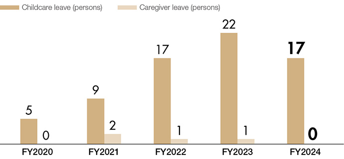 We have introduced childcare and caregiver leave systems and a shortened working hour system for employees with childcare and caregiving responsibilities. Using these systems, employees can take care of their children and family members without having to resign.