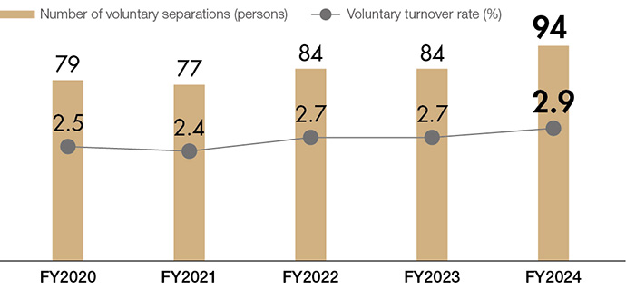 The Company has been promoting the creation of a workplace where diverse human resources can continue to work with peace of mind. As part of this initiative, we have been engaged in efforts to reduce the voluntary turnover rate. We are working to increase the retention rate and strengthen our human capital by fostering an environment where employees with diverse backgrounds in gender, age, life stages, etc. can play active roles according to their different values and working styles.