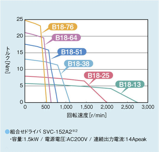 回転トルク曲線:組み合わせドライバ SVC-152A2※2 容量:1.5kW/電源電圧:AC200V/連続出力電流:14Apeak