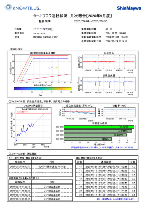 当社が2019年9月1日に発売したターボブロワ専用の遠隔監視サービス "KNOWTILUS" は、ターボブロワ本体に表示される運転画面を手元のパソコンやスマートフォンに表示させ、遠隔からの状態監視を可能にするもので、警報やエラー発生時は、関係者にエラー内容と対処方法を自動的にメール通知する機能を有し、早期発見によるダウンタイム短縮化が図れると好評を得ています。ターボブロワ向けでは初となるAI※1を活用した運転データの分析により、トレンドデータに基づきエラーの原因を推測できることが最大の特長で、懸案となっている設備管理業務の支援や予防保全による安定稼働を実現してきました。